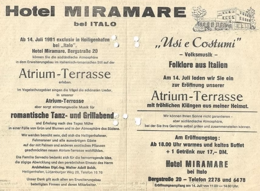 Press ad of a gig at Hotel Miramare, Heiligenhafen. 1981